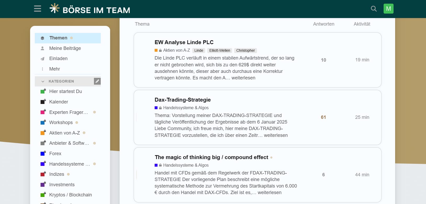 „Börse im Team“ ist die erste deutschsprachige Börsen-Community, die ambitionierte Privatanleger und Trader zusammenbringt. Unser Fokus liegt auf dem Austausch, Lernen voneinander und gemeinsamer Weiterentwicklung – damit Du erfolgreicher investieren kannst.